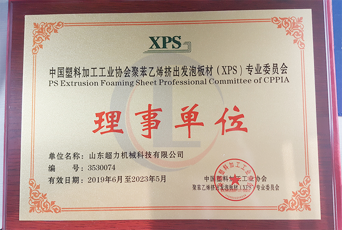 山東超力機(jī)械有限公司,憑借過硬的二氧化碳擠塑板(CO2-XPS)研發(fā)、生產(chǎn)技術(shù)與優(yōu)異的擠塑板設(shè)備質(zhì)量,被中國塑料加工工業(yè)協(xié)會聚苯乙烯擠出發(fā)泡板材(XPS)專業(yè)委員會授予協(xié)會理事單位。